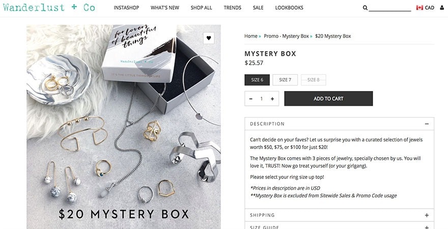 Wanderlust + Co在他们的20美元神秘盒子中使用了惊喜元素。他们寄给顾客价值50美元、75美元或100美元的盒子,零售价仅为20美元。问题是你不能选择盒子里的东西。这些产品是由一名员工策划的。对于那些想要惊喜的顾客来说,这是很棒的。然而,对于那些购买了无法销售的实体产品来转移库存的公司来说,这也是一个很好的选择。
