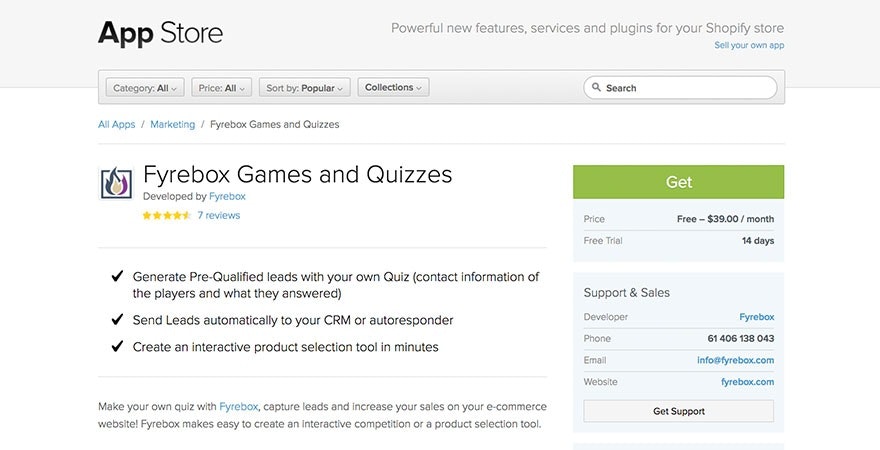 Fyrebox游戏和测验是一个游戏化应用程序,商店老板可以在他们的商店创建测验,拼图和绞刑游戏。你可以利用游戏来建立线索,更多地了解你的客户或娱乐他们。测验可以将客户直接引导到产品页面。你可以修改颜色,从9种语言中选择,等等。