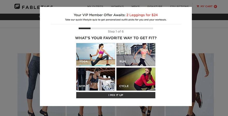 测验营销通常由顶级品牌进行,以使个性化过程游戏化。零售商通常没有足够的新客户数据来为他们定制个性化的产品。这就是测验如此有效的原因。顾客在进入网上商店之前要参加一个有趣的测试,这样他们看到的唯一产品就是他们的尺寸和基于他们的时尚感。等品牌Fabletics使用这种策略会非常成功。