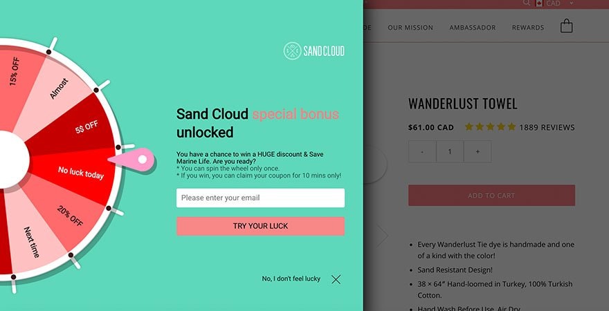 游戏化的例子:砂云使用带有退出意图的旋转器应用。当客户将鼠标移向关闭浏览器选项卡时,旋转器就会出现在他们的商店中。客户需要输入他们的电子邮件(允许沙云向他们重新推销)来旋转轮子。当顾客旋转转轮时,他们会得到5美元、15%或20%的折扣。旋转器通常是固定的,这样顾客总是能得到产品的折扣,这样他们就会被激励去购买。