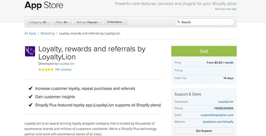 忠诚、奖励和推荐由Loyalty Lion提供了一个系统,可以奖励客户的各种行为,如社交媒体参与、生日、订阅电子邮件列表和购买产品。你可以用折扣、免费产品、免费送货等奖励客户。它甚至集成了评论应用程序,为在你的商店留下评论提供积分。
