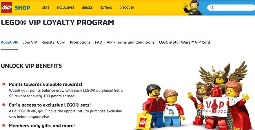 例子:乐高为其粉丝群创建了一个VIP忠诚计划。顾客每购买一次乐高就能获得积分。那些报名参加该计划的人将比公众更早获得购买新产品的机会。全年都有专门为会员提供的特别优惠。新会员注册后还可免费获得乐高钥匙链一个。该计划唯一的缺点是儿童往往是主要目标人群,然而,只有18岁以上的人才能注册成为会员。