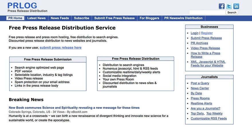 公关的日志是一个免费的新闻稿分发工具,你可以用来分享你的新闻稿给更多的观众。您需要创建一个帐户。如果你想要获得更多的用户,你可以支付一定的费用来提高你的新闻稿的曝光度。