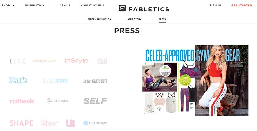 例子:Fabletics在他们的在线商店的关于我们的页面上有一个新闻版块。他们的品牌曾登上《Elle》、《人物》、《Instyle》等杂志。当你点击outlet时,文章功能就会出现在右边,以证明他们已经被推荐为社会证明。当客户看到顶级媒体对品牌进行了报道时,这有助于建立品牌信任和可信度。高质量的新闻报道也有助于建立影响力。