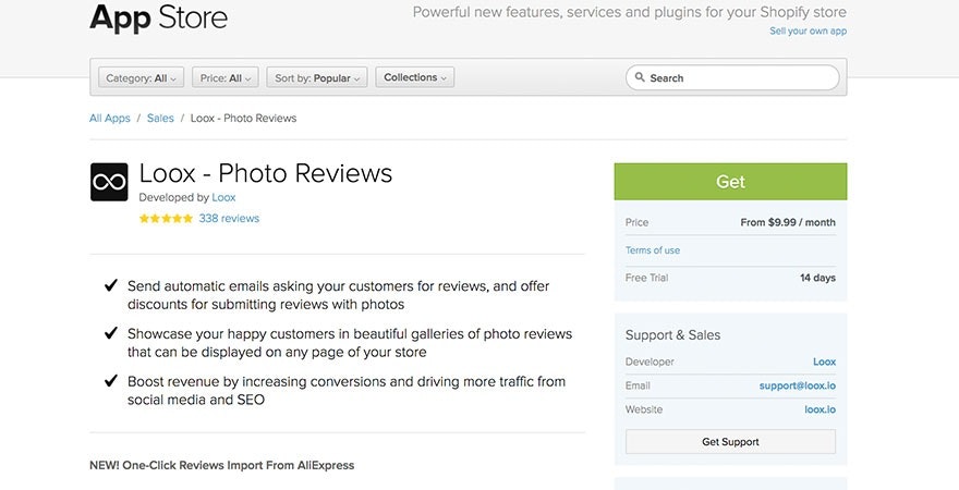 Loox是一个照片评论应用程序,展示客户的照片。书面评论可能令人信服,但照片评论展示了另一个层面的产品。展示带有图片的客户评论,不仅表明其他人在购买你的产品,而且他们也非常喜欢它,分享照片——产品看起来很棒。当顾客看到这些类型的评论时,如果评论是积极的,他们就更有可能从你的商店购买该产品。