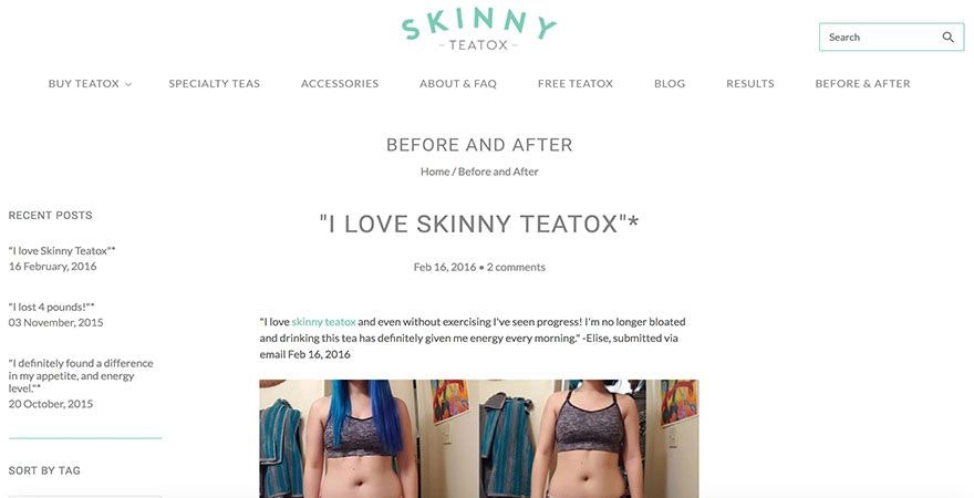 瘦Teatox通过在他们的网站上有一个前后部分来增加他们的社会证明。其中包括顾客发来的减肥照片。他们甚至会披露一些信息,比如这个人是否锻炼,以达到完全透明的目的。这样一来,顾客就会有动力喝这种茶来减肥,因为他们看到这种茶很有效。