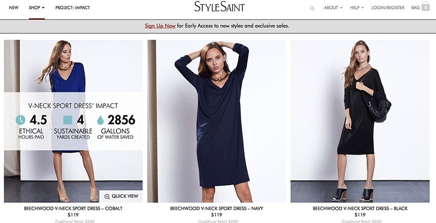 风格的圣在产品列表页面上展示他们的社会责任。当顾客在产品照片上徘徊时,他们会看到这个品牌是如何承担社会责任的。你将看到为该产品付出的道德工时数。它还提到了创造的可持续面料码数。最后,它列出了节约的水的加仑数。产品页面也列出了这些详细信息。甚至在产品描述中也提到了这些材料的可持续性,以及为什么它们比更常见的面料更好。