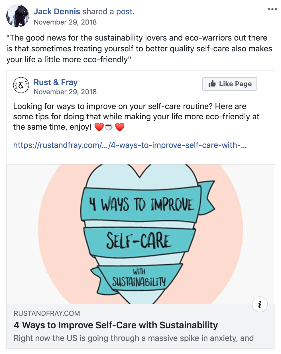 我看到的第一个帖子给了我一些语言的想法,这些语言可以用于环保的观众。在同一细分市场销售的人可以在他们的品牌中加入“生态战士”和“自我护理常规”之类的短语,以更好地吸引受众。