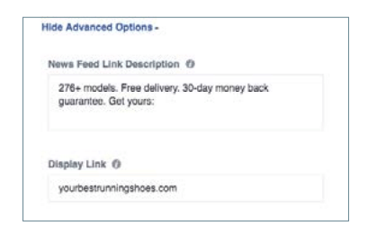 Below Call To Action, click “Show Advanced Options” and enter a News Feed Link Description that will appear below your headline.