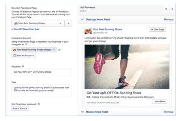 Then, enter the headline and text that will be used for your ad and choose an optional call-to-action button. Text will appear above the image and the headline immediately below it.