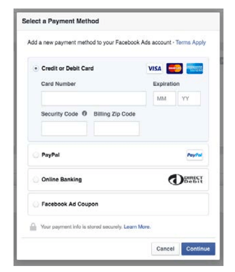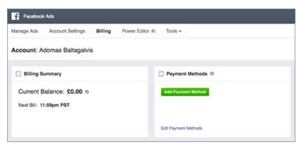 Next, add a new payment method under the “Billing” tab in the Ads Manager: