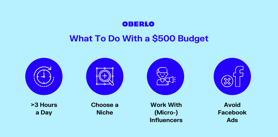 - With a $500 or less budget, pick a niche, invest your time in working with micro-influencers, and avoid Facebook ads.