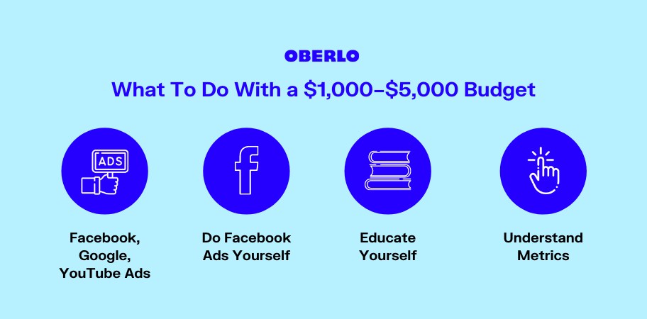 - With a budget of $1,000 to $5,000, dive into Facebook ads and do it yourself. Educate yourself around the metrics and KPIs.