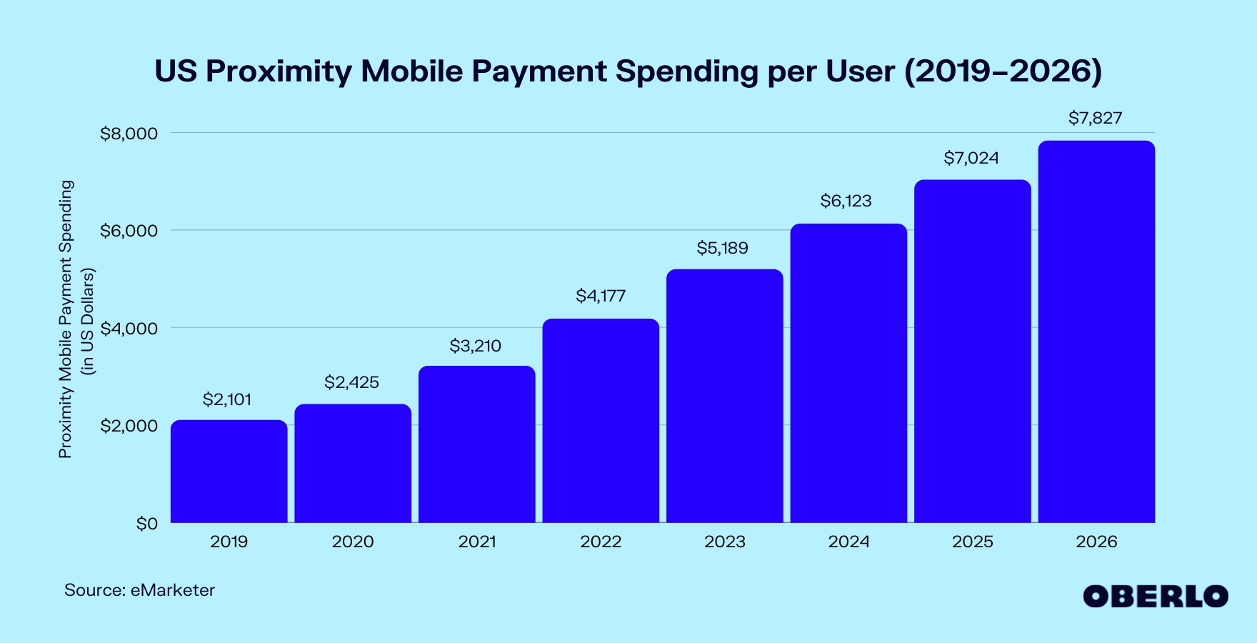 根据最近的报告在美国的移动支付行业,到2023年,每个手机用户的近距离移动支付支出预计将达到5189美元。这比2022年的4177美元同比增长24.2%。