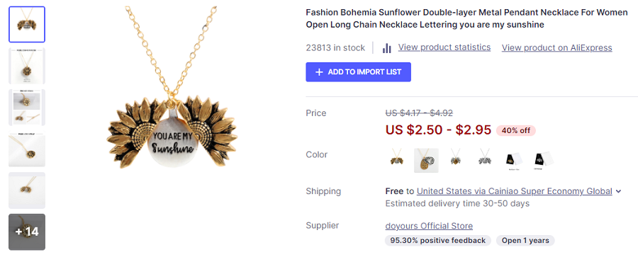 最棒的是,向日葵吊坠项链的平均价格是3美元,而大多数商家的售价是19.99美元。你算算,这是一个惊人的差额。当你打开这条吊坠项链上的向日葵时,它说:“你是我的阳光。”超级可爱,对吧?