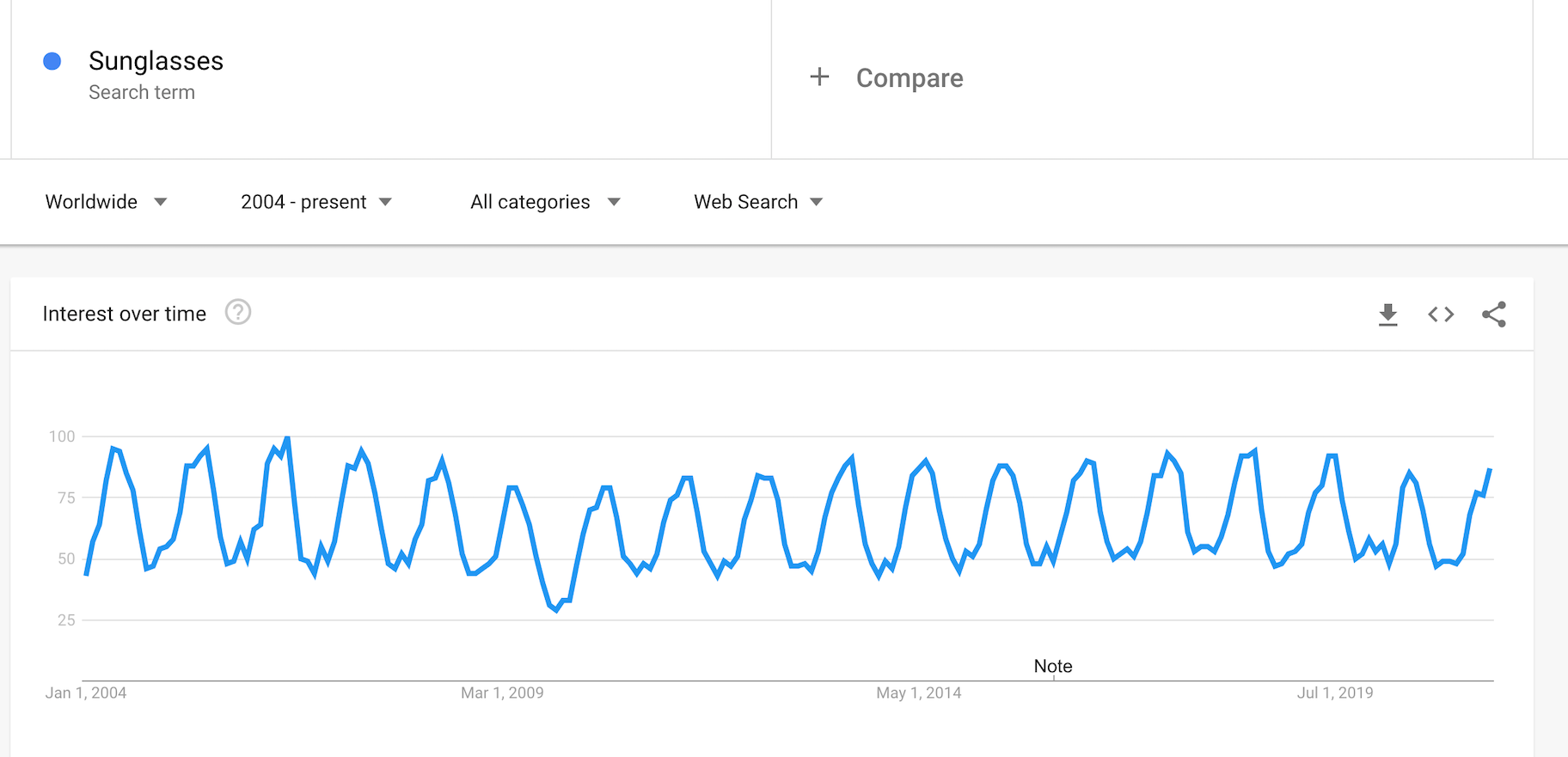 谷歌趋势数据这证明了太阳镜搜索每年夏天都很热,这个夏天也不例外。
