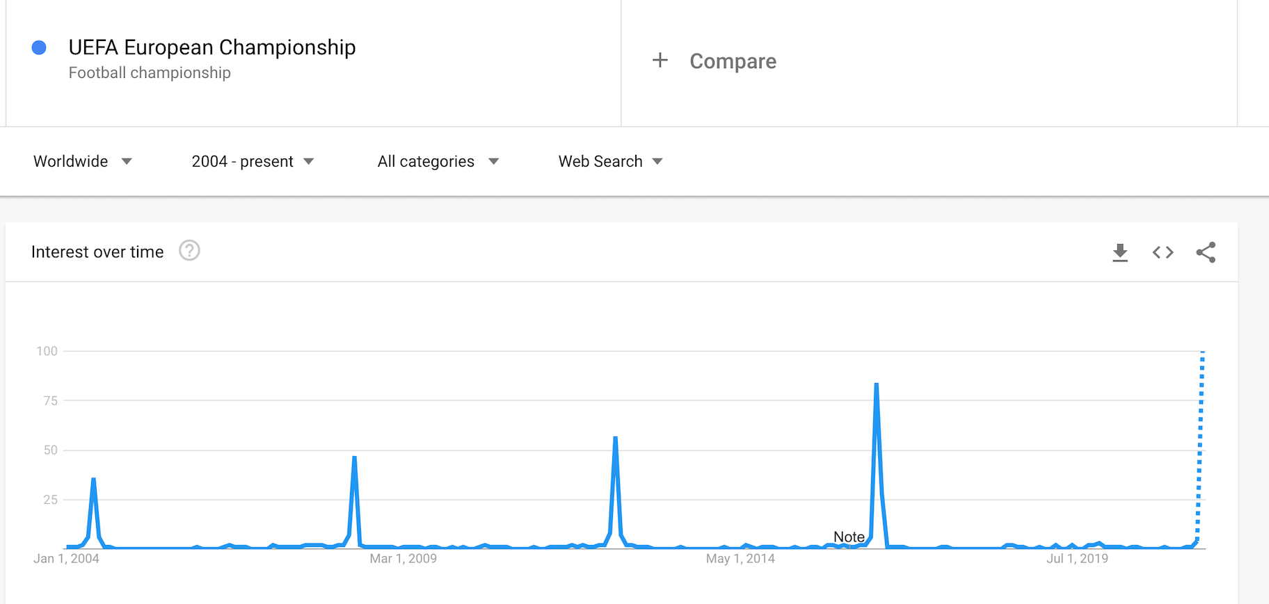 非常有趣的是,当我们去谷歌趋势查看时数据为一般欧洲足球锦标赛在美国,我们看到这个月(7月)出现了一个巨大的高峰,所以现在是销售这款产品的最佳时机。