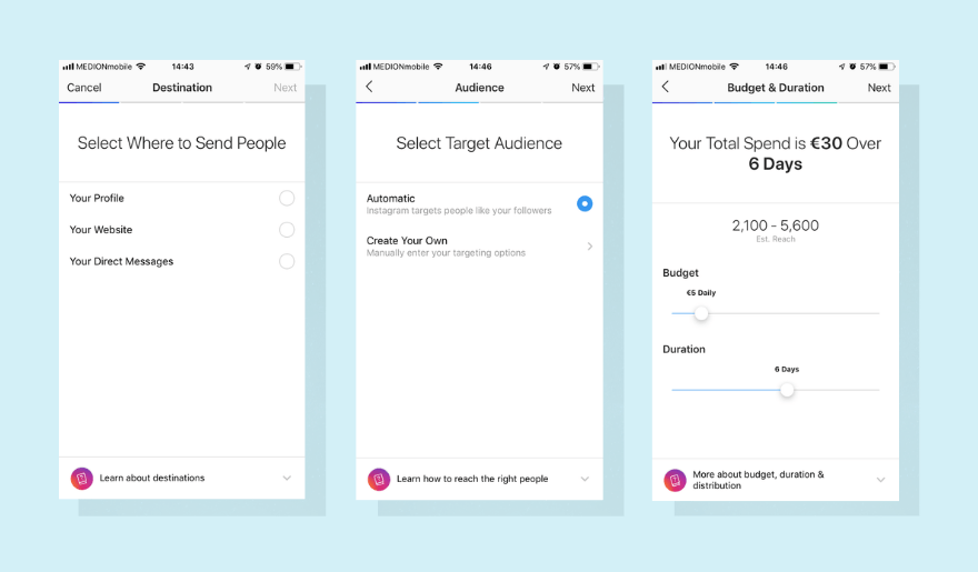 一旦你在Instagram上建立了一个商业资料,你就可以决定你想花多少钱,你想在哪里看到你的广告,以及你想让它们运行多长时间。Instagram提供了多种目标选择,所以你可以选择最适合你的业务需求的。