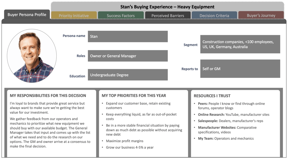 TheBuyer Persona Instituteprovides a detailed example of a buyer persona. This includes all of the basic demographic information andpsychographic informationsuch as their priorities, potential objections, criteria for making decisions, and what they consider valuable.