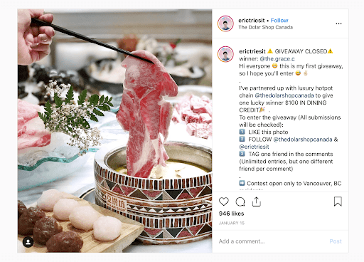 举个例子,让我们看看美食博主EricTriesIt是如何利用Instagram赠品的。