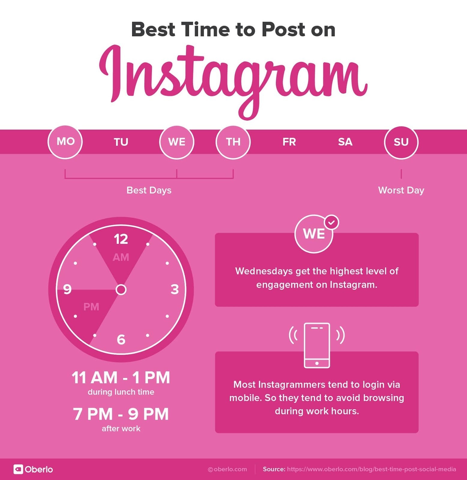 根据我们的研究,在Instagram上发布照片的最佳时间在工作日的中午左右。由于大多数用户都是用手机查看Instagram,而且往往不会在工作时间浏览,所以如果你在晚上发照片,也会更成功。