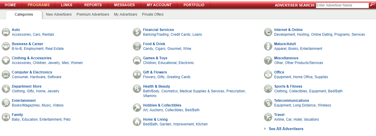 一旦你注册并登录,你将在乐天附属仪表盘。要开始寻找商家和附属链接,你需要选择“程序”选项卡,它会将你重定向到一个页面,显示乐天的产品有多么庞大:
