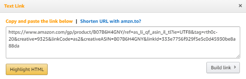你也可以用amzn缩短这个链接。,如果您打算分享完整链接,这可能是一个好主意。更短的链接看起来更好,根据你使用的平台,也不会那么令人困惑。