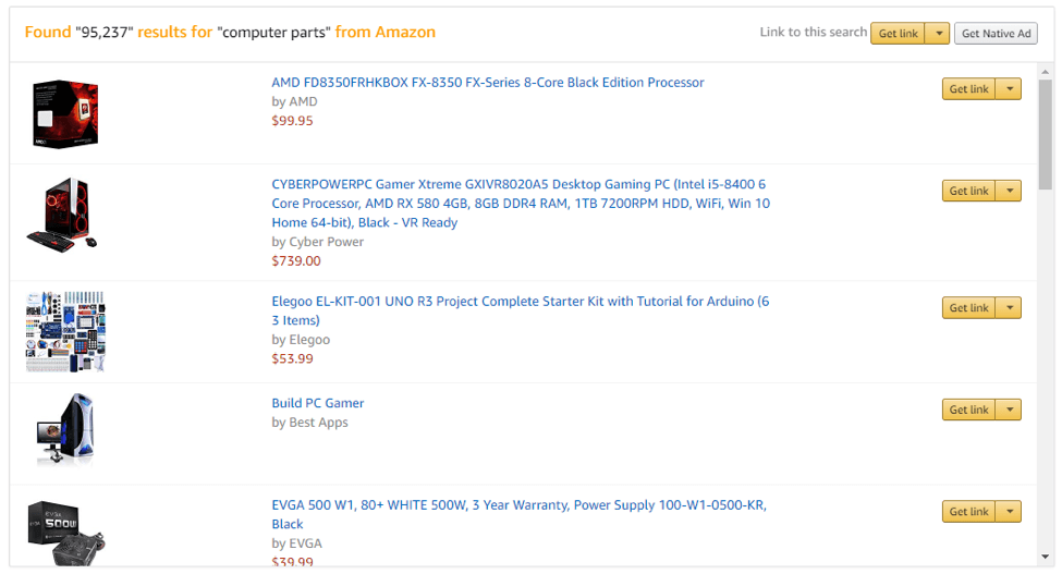 一旦你找到了你想要推广的产品,你需要采取的最后一步是点击相应产品上的黄色向下箭头。这将弹出所选产品的文本链接,您可以使用它在促销中分享。