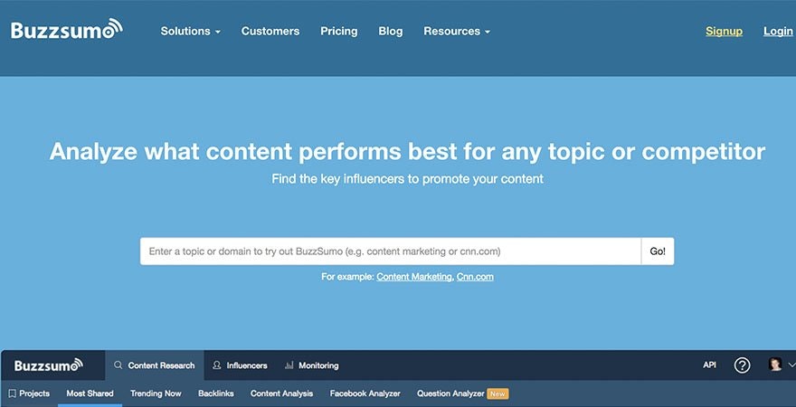 BuzzSumo是一个竞争对手的分析工具,让您看到在社会分享方面表现最好的内容。您可以使用该工具查看您的品牌的最佳内容和您的竞争对手。如果您计划为您的商店创建内容,您可以使用您的竞争对手的数据来规划您应该添加到您的博客的内容类型。你可以通过这种方式找到写博客的灵感。