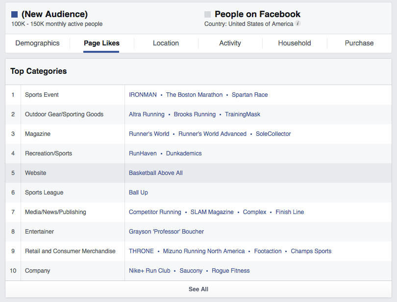 你应该避免使用通用的兴趣爱好,比如自然、运动或食物,而选择非常具体的兴趣爱好:相关品牌、作家、书籍、杂志、网站甚至其他Facebook页面。