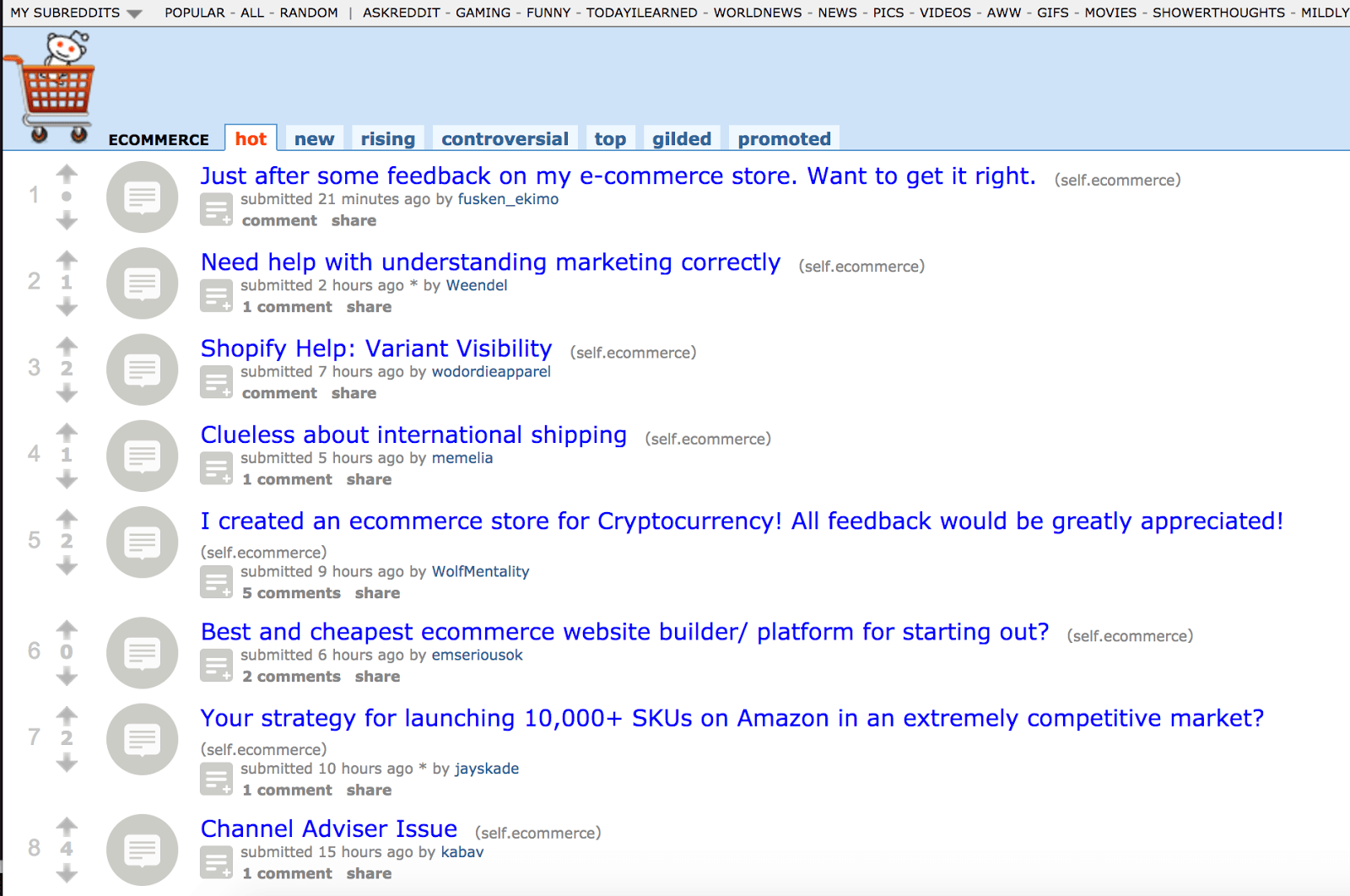 Reddit是一个功能巨大的论坛网络,在这里,讨论的feed来自围绕太阳下几乎所有话题的帖子。这些线程通常源于一个问题或链接到另一个网站、图像或视频。Reddit每年拥有710亿的页面浏览量,这无疑是另一个未被开发的电子商务企业吸引眼球的资源。对于那些刚刚开店,还没有最大的客户群或社交媒体存在感可以利用的人来说,这是一个特别好的起点。Reddit为那些因为对你的产品感兴趣而被淘汰的用户提供了直接的联系和曝光。