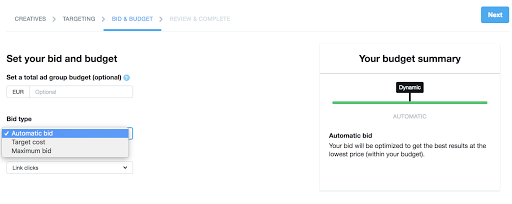 你也要考虑你想你的最高出价金额是什么。这将有助于设定每次用户粘性的价格上限,这样Twitter就会在你的预算范围内分配最可能的印象。如果你不确定从哪里开始,请查看该平台的建议投标工具。您可以使用批量编辑功能来调整您的出价设置,时间框架和预算后,你的广告已经推出。或者,你可以坚持默认的自动竞价选项,Twitter会根据你设定的目标优化你的预算,以获得最佳结果。
