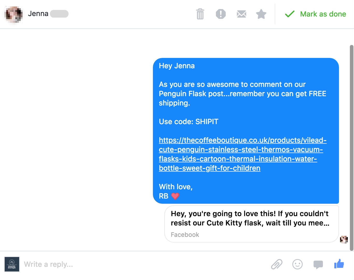- 设置一个Facebook Messenger Bot联系任何评论提供免费送货或10%折扣的人。包括链接,这样他们就可以立即点击。