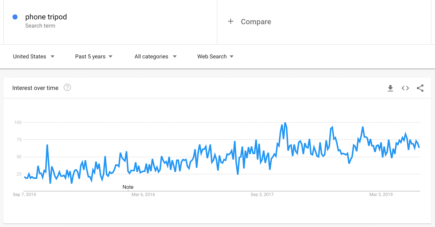 Over the past five years there’s been some pretty rapid growth in search volume for phone tripods.