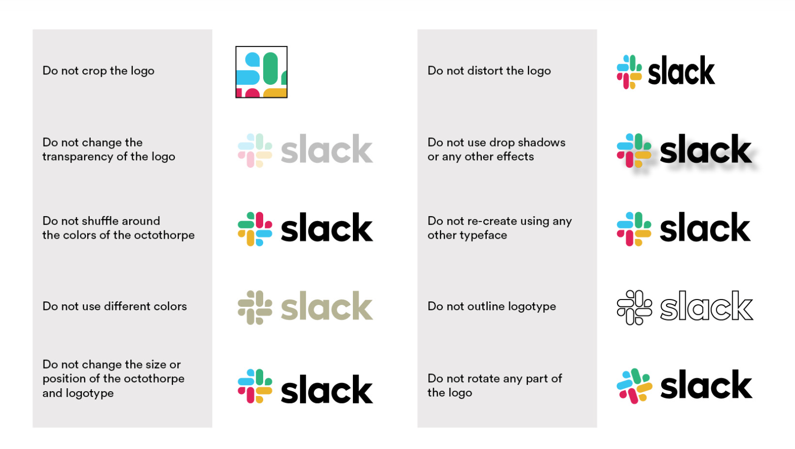 这里的关键是比较列表。Slack通过在可接受的情况下显示不适当的用例来简化其品牌概念。你可以清楚地看到它的标志是如何比较和对比的。它的品牌的声音也得到了类似的待遇。