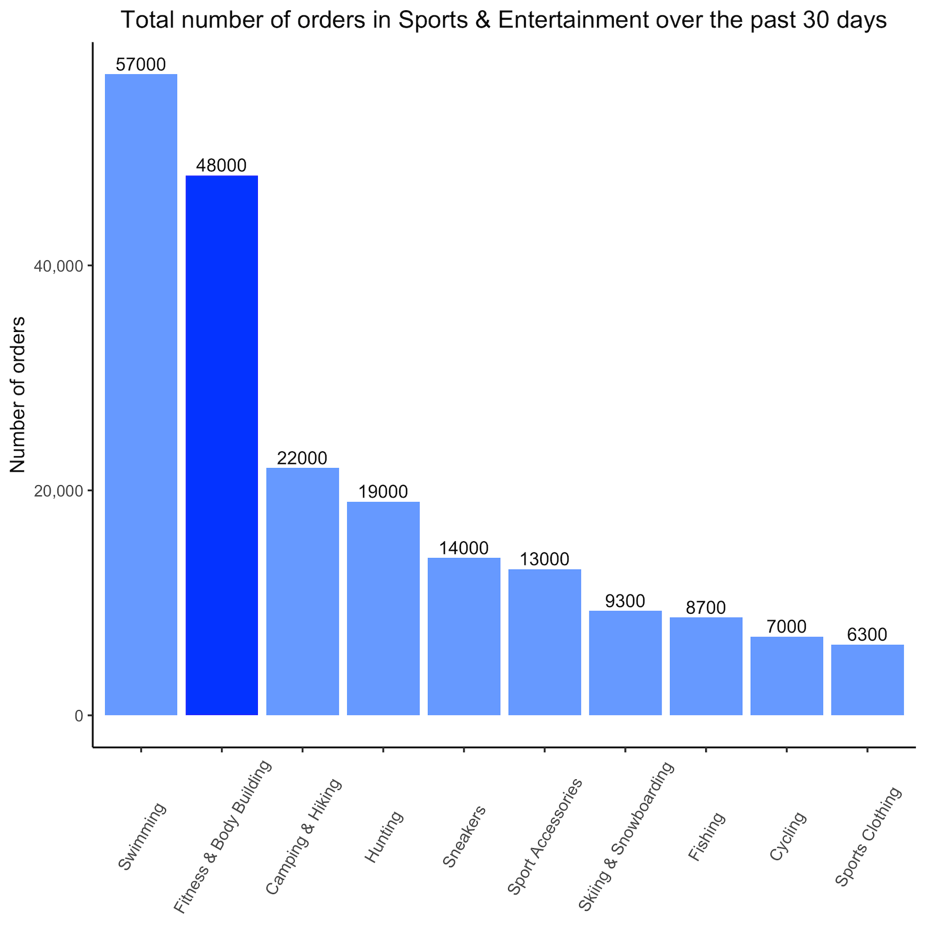 正如我们所看到的,突出显示的健身和健美子类别(瑜伽裤所属)是第二受欢迎的,在过去30天内收到了4.9万份订单。