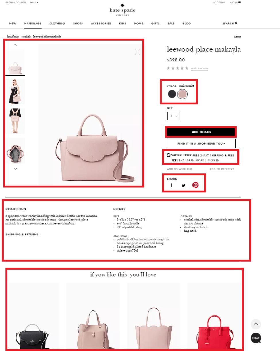 为什么我们喜欢它:产品图像在纯白色背景下弹出。这张照片独一无二,风格独特,引人注目。黑色的“添加到包”在清晰的白色背景下弹出。社交分享按钮是可见的,但不是焦点,他们也没有详细说明任何具体的数字。副本相对较短,并提供要点。页面上也有评论。如果没有那么多类似风格的照片,推荐的照片将是最好的。然而,最右边的这款与其他类似款式的产品相比,效果很好。