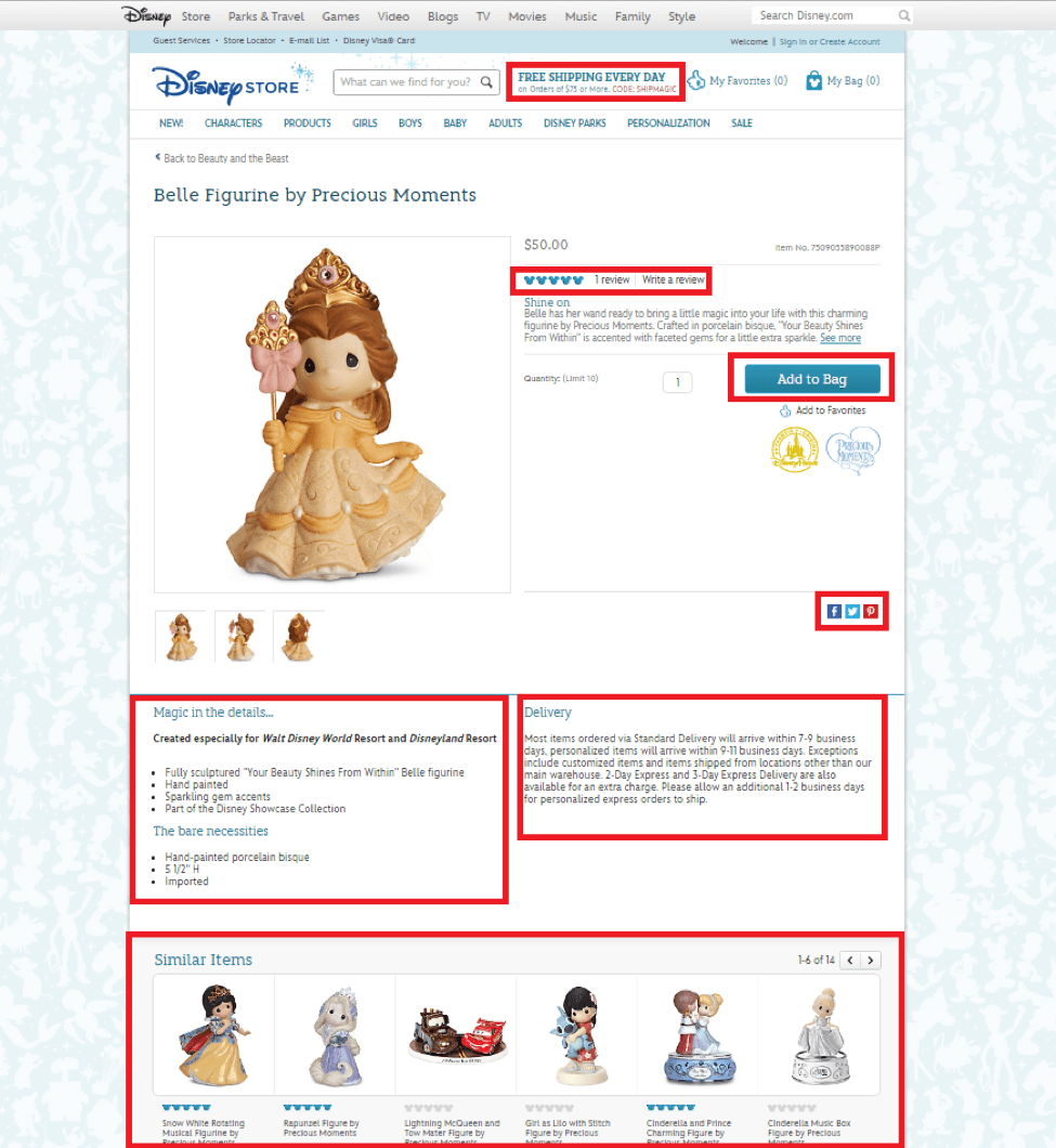 为什么我们喜欢它:迪士尼商店的产品页面很干净。它在标题中提供了运输信息。这个产品有不同的角度。有一个复习部分。产品文案很短,在产品图片下面也有要点。“添加到包”与白色背景形成对比,同时与产品品牌保持一致。然而,不同的颜色可能转换得更好。交货信息也可以在产品页面中找到。类似的产品具有相似的产品风格,但具有不同的角色,熟悉迪士尼品牌的人会突然想到。