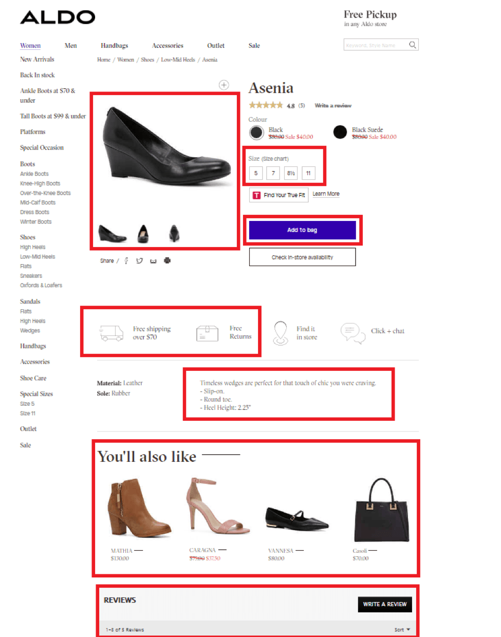为什么我们喜欢它:这个产品页面非常直观和干净。产品图像是高分辨率的,有不同的角度,所以客户可以做出明智的决定。它还在“尺寸”部分展示了他们有哪些尺寸。“添加到包”是一个充满活力的蓝色,在他们干脆的白色背景下很好地流行起来。他们直接在产品页面上展示免费送货和免费退货图标,方便访问。他们的产品描述短小精悍,只有3个要点和一句话描述产品。它还提供了一个推荐产品部分,其中的产品看起来与展示的产品完全不同,以防止客户混淆。最后,还有一个客户反馈的评论部分。