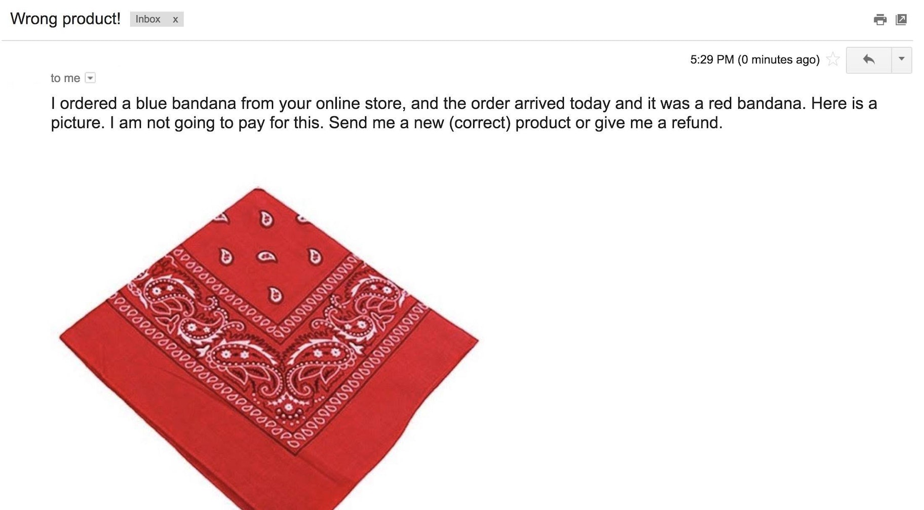 Suppose you run a store specializing in clothing accessories. A customer places an order for one of your blue bandanas, and you receive an email 10 days later saying that the bandanaarrived – and it’s red.