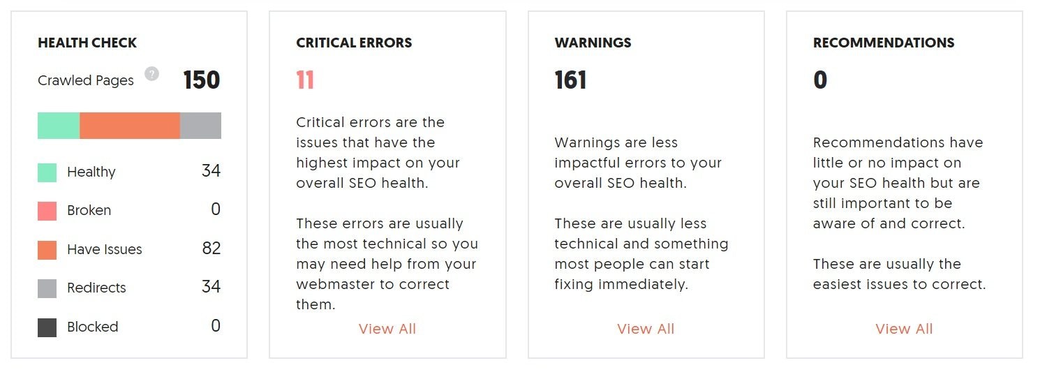 向下滚动时,您将看到一个站点运行状况检查器,其中显示严重错误、警告和建议。