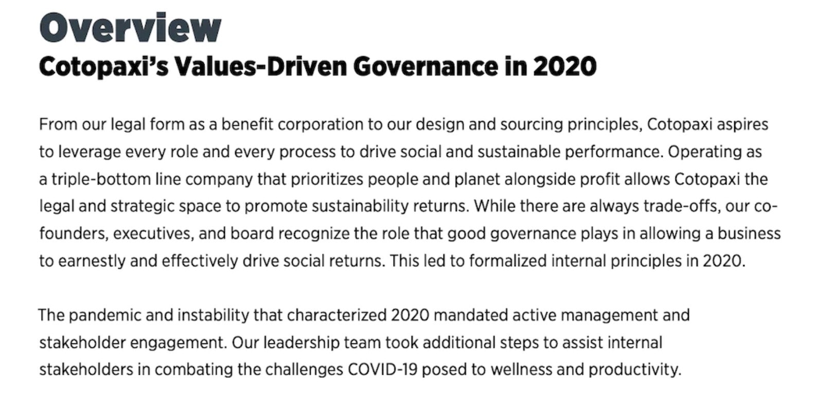 摘要标题为“概述”,重点介绍了品牌的使命和内部原则。它还讨论了COVID-19大流行的影响并提到公司已采取措施支持受影响的利益相关者和团队。这为报告的其余部分奠定了基础,告诉读者他们将更多地了解科托帕西的新原则,以及它如何加强帮助利益攸关方应对COVID-19带来的挑战。