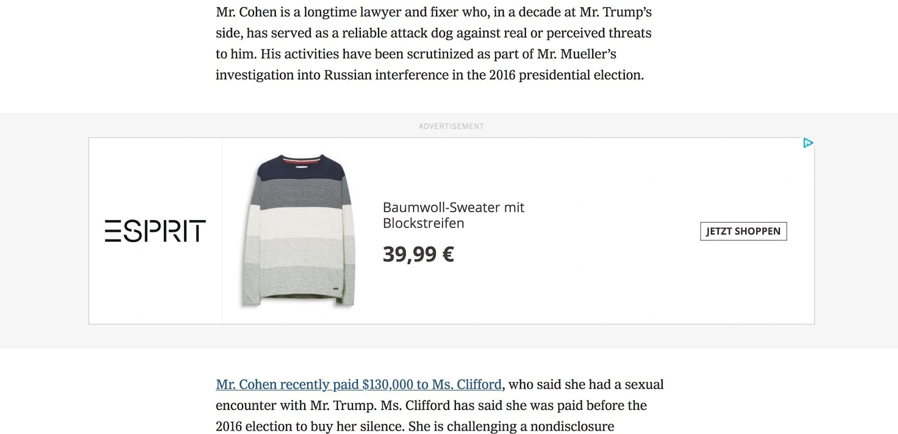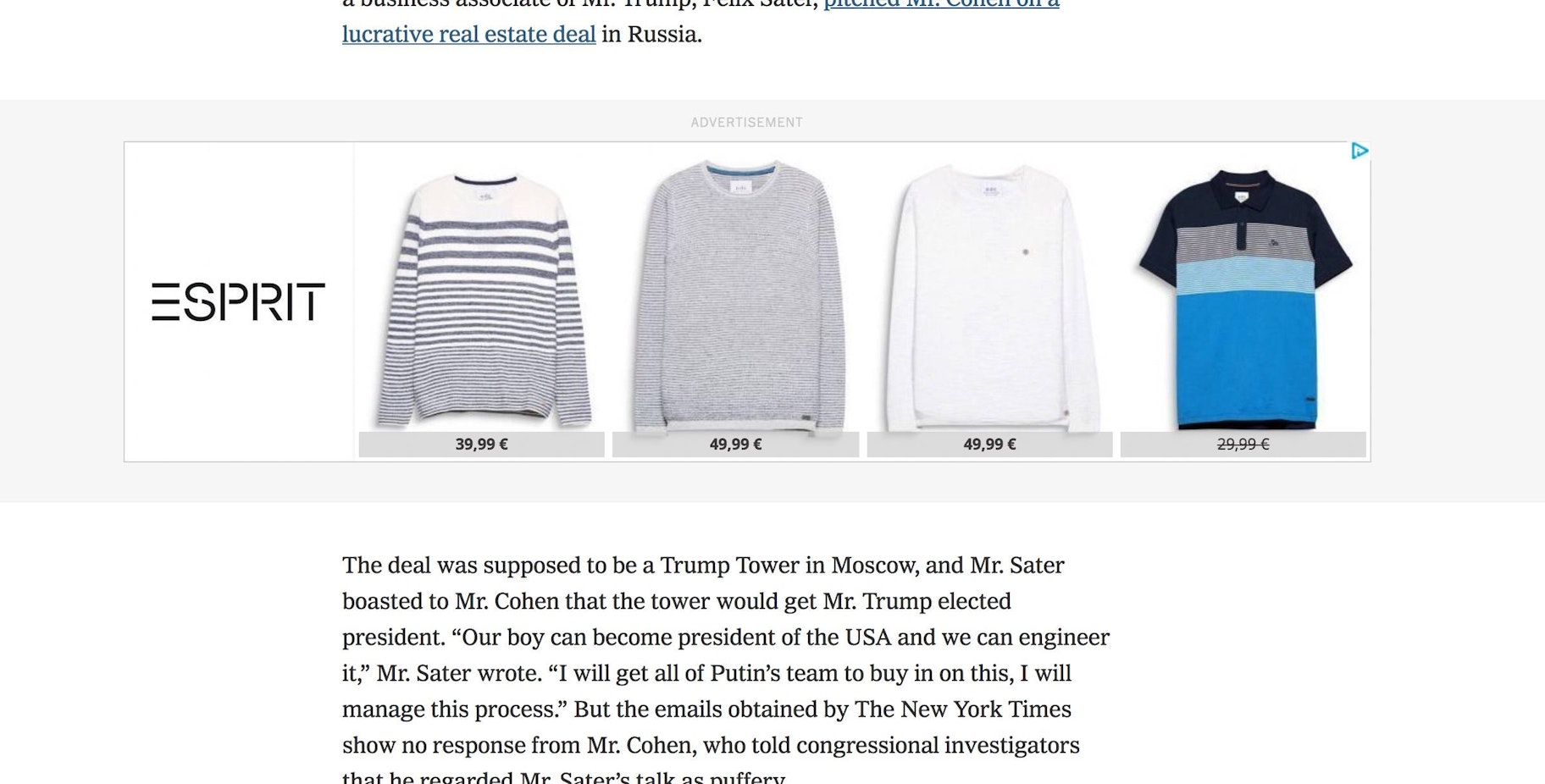 如何《纽约时报》也知道我们在思普瑞特吗?好吧,他们没有。但像Criteo这样专门针对重新定位的工具确实可以做到。Criteo是与Esprit网站相连的约30个广告工具之一。就像Facebook Pixel帮助Facebook用相关广告填充广告空间一样,Criteo也有帮助《纽约时报》填满它的有相关广告的广告位。