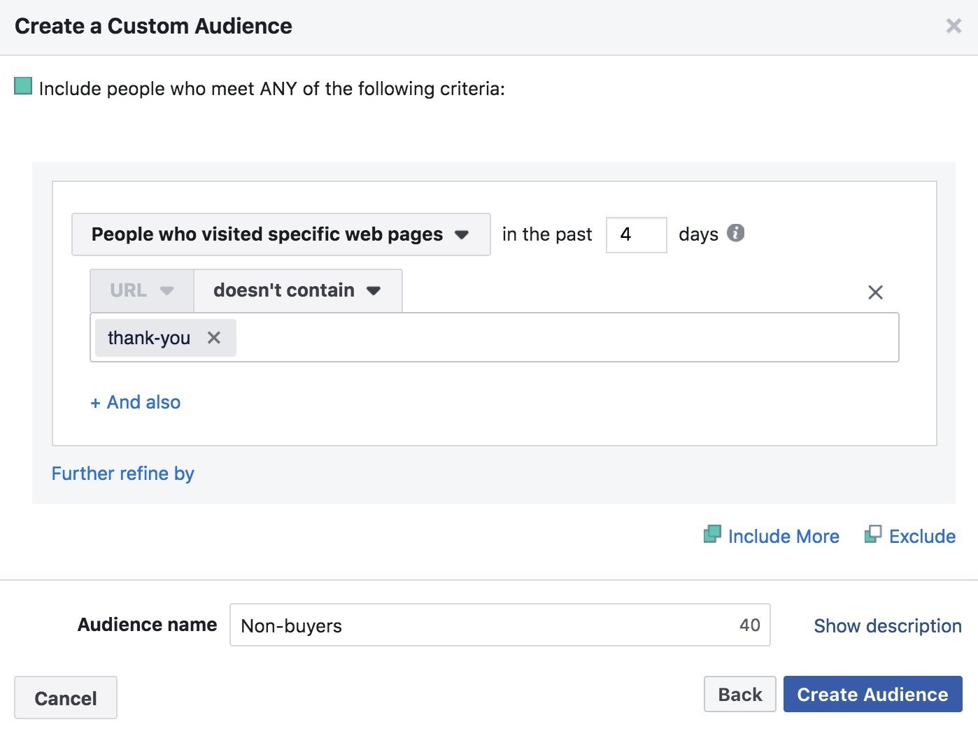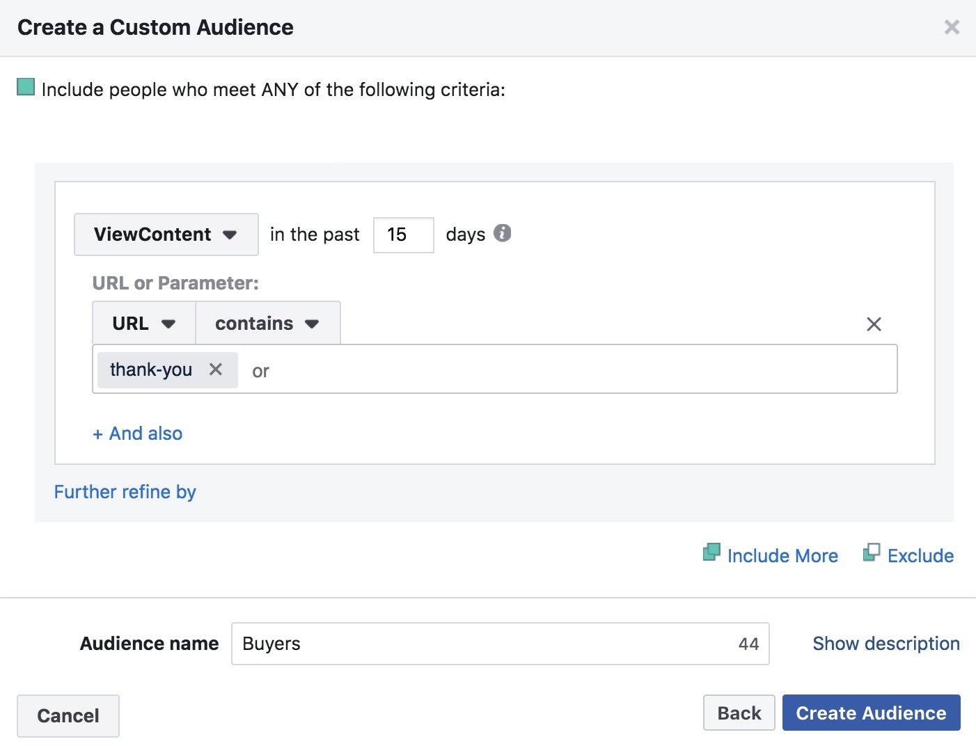 你还可以将Facebook广告定位于已经皈依Facebook的用户。例如,也许您想用折扣代码来对待买家下一个购买。你可以通过为转换后的页面设置URL规则来做到这一点——比如,a谢谢你!页面。