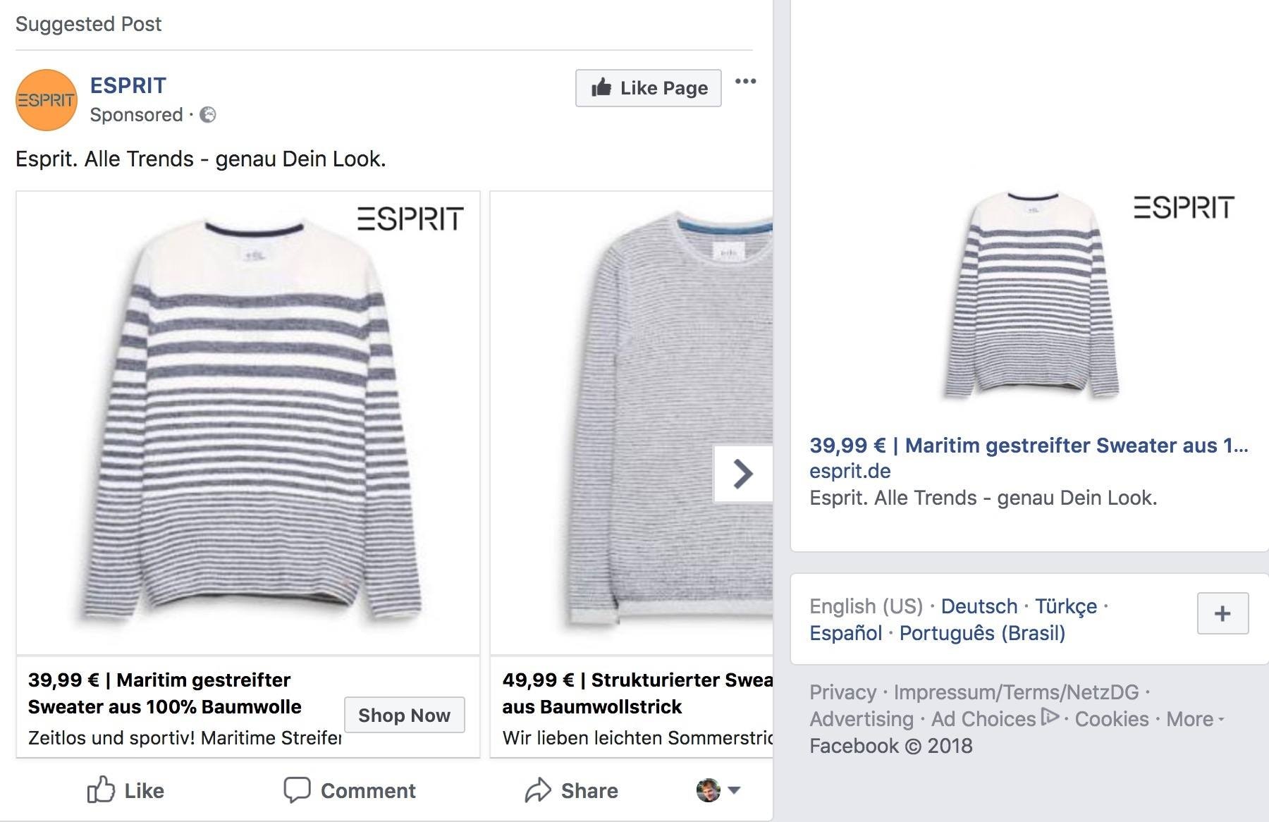 我们不可能知道Esprit和耐克为我们这样的消费者制定了什么样的目标规则。例如,如果我们没有将这些商品添加到购物车中,我们还会看到这么多广告吗?也许地理位置也起了作用:如果我们从韩国而不是德国购物,这些广告会以同样的频率出现吗?
