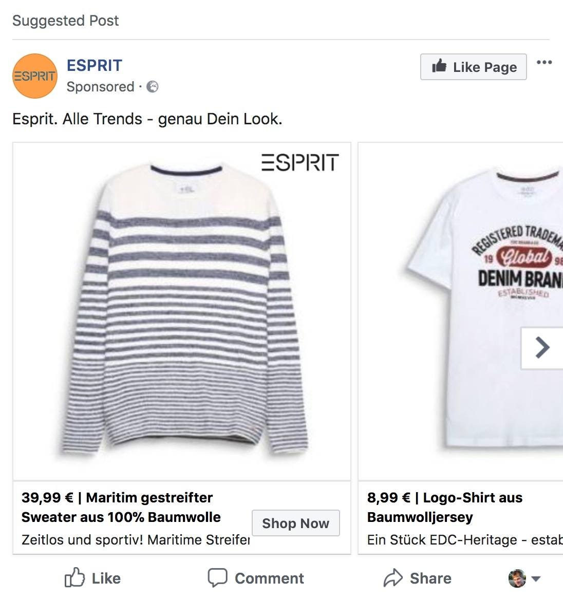 今天我们要参观两家商店。首先是Esprit。另一个是耐克。这些商店没有什么不寻常之处;它们只是被用来代表一般的电子商务。可以肯定的是,Esprit和耐克在跟踪和广告方面都没有做任何不寻常或邪恶的事情。他们只是一些服装店,利用Facebook像素追踪来吸引常客。