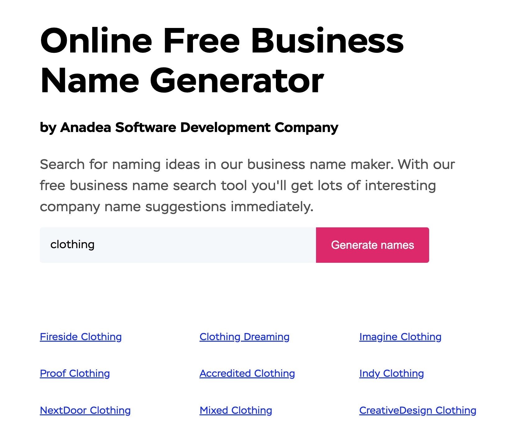 要使用此企业名称生成器,请在搜索栏中输入不同的单词,直到对结果感到满意为止。因此,举例来说,如果你不喜欢“衣服”这样的关键词出现的结果,你可以通过更具体地搜索你的公司或你想要的展示方式来重试。它可以是“复古衣服”或“大号衣服”。Anadea品牌名称生成器是免费的,但它也非常容易使用,非常适合研究小型企业名称的想法。