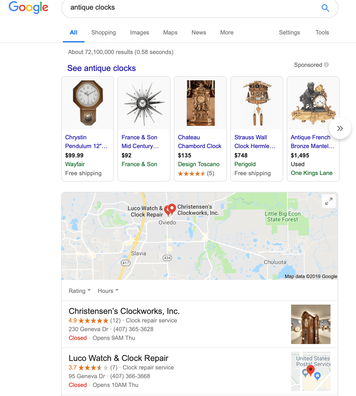 例如,在搜索“古董钟”时,许多用户都在寻找他们的购买选择。GMB列表更有可能显示那些没有国际知名品牌或没有为赞助产品列表支付大量费用的商店。