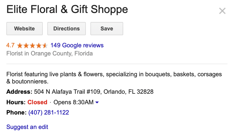 在下面的例子中,这个花店的顾客很有可能经常搜索“胸花和胸花”或“有活植物的花店”这样的词。列出这些将允许浏览者立即知道该业务提供什么,但它也可以帮助确保该列表显示在这些搜索词列表的顶部。
