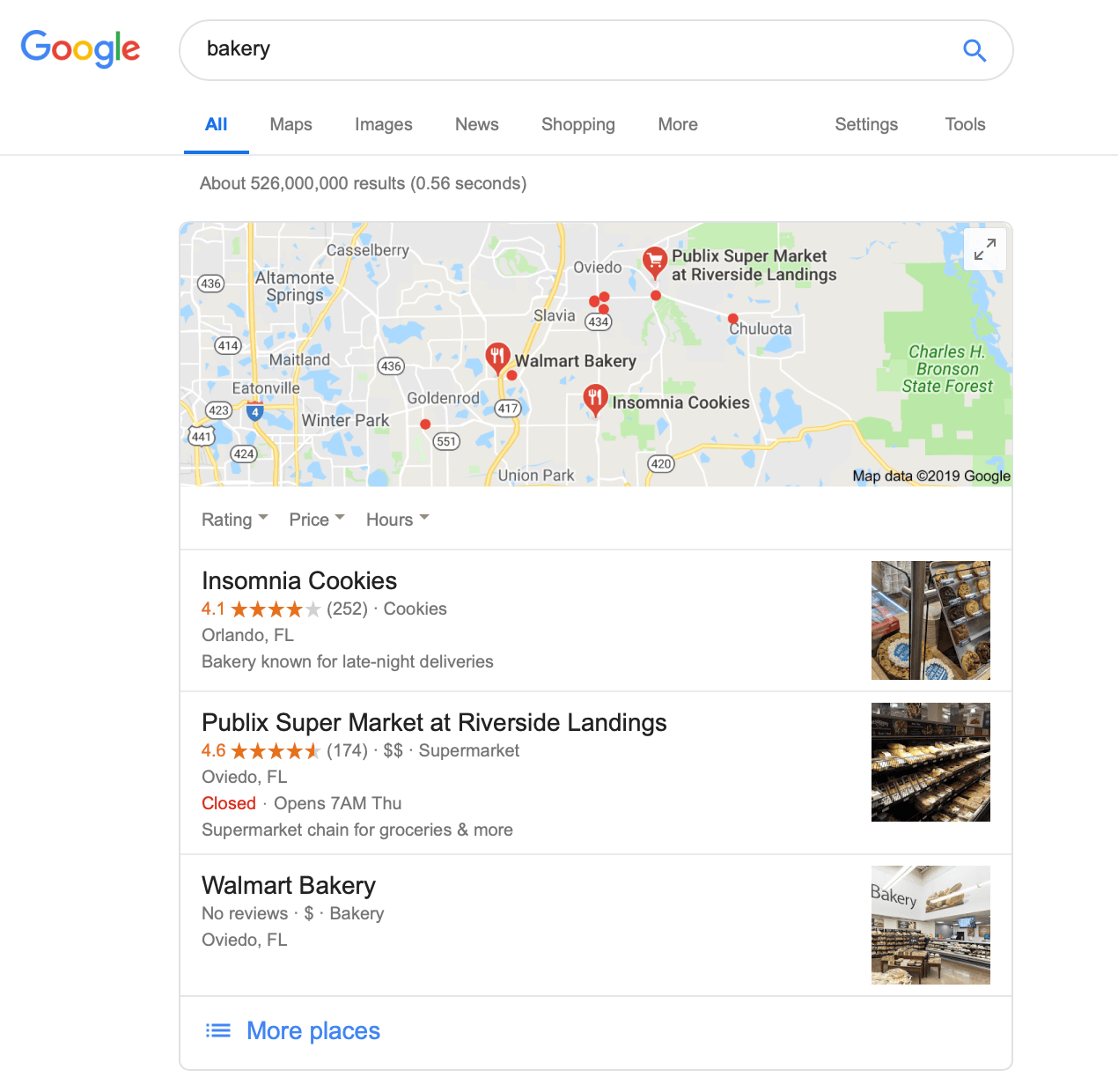 想想看。如果你的品牌试图在传统的自然搜索中获得“家具店”的排名,你将不得不与Havertys和Ashley’s家居等大公司竞争。然而,在Google My Business上拥有一个优化的个人资料,可以让中小型企业在关键词相关性和客户评级等因素的基础上排名靠前。